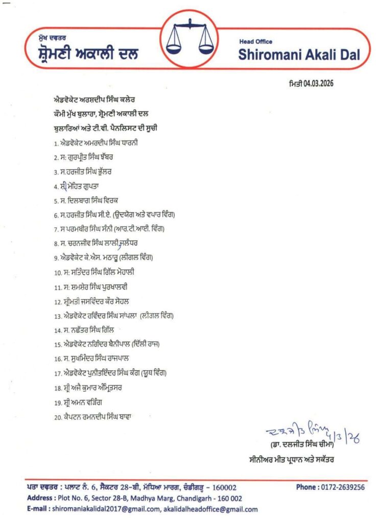 ਚੰਡੀਗੜ੍ਹ (ਵੈੱਬ ਡੈਸਕ)- ਸ਼੍ਰੋਮਣੀ ਅਕਾਲੀ ਦਲ ਦੇ ਪ੍ਰਧਾਨ ਸੁਖਬੀਰ ਸਿੰਘ ਬਾਦਲ ਨੇ ਪਾਰਟੀ ਦੇ ਕਮਿਊਨੀਕੇਸ਼ਨ ਢਾਂਚੇ ਨੂੰ ਹੋਰ ਮਜ਼ਬੂਤ ਕਰਨ ਲਈ 21 ਪਾਰਟੀ ਬੁਲਾਰਿਆਂ ਅਤੇ ਟੀ. ਵੀ. ਪੈਨਲਿਸਟਾਂ ਦੀ ਇਕ ਵਿਆਪਕ ਸੂਚੀ ਦਾ ਐਲਾਨ ਕੀਤਾ ਹੈ। ਇਸ ਦੀ ਜਾਣਕਾਰੀ ਸਾਬਕਾ ਮੰਤਰੀ ਡਾ. ਦਲਜੀਤ ਚੀਮਾ ਵੱਲੋਂ ਸੋਸ਼ਲ ਮੀਡੀਆ ‘ਤੇ ਦਿੱਤੀ ਗਈ ਹੈ।