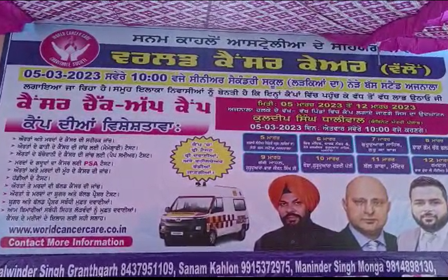 ਅੰਮਿਤਸਰ ਦੇ ਹਲਕਾ ਅਜਨਾਲਾ ਦੇ ਜੰਮਪਲ ਐਨ ਆਰ ਆਈ ਨੌਜਵਾਨ ਸਨਮ ਕਾਹਲੋਂ ਵੱਲੋਂ ਸਰਹੱਦੀ ਖੇਤਰ ਅਜਨਾਲਾ ਦੇ ਲੋਕਾਂ ਲਈ ਵਰਲਡ ਕੈਂਸਰ ਕੇਅਰ ਦੀ ਮਦਦ ਨਾਲ ਸਰਹੱਦੀ ਤਹਿਸੀਲ ਅਜਨਾਲਾ ਦੇ ਸਰਕਾਰੀ ਸੀਨਿਅਰ ਸਕੈਂਡਰੀ ਸਕੂਲ ਲੜਕੇ ਵਿਖੇ ਫ੍ਰੀ ਕੈਂਸਰ ਚੈਕਅਪ ਕੈੰਪ ਲਗਾਇਆ ਗਿਆ ਜਿਸ ਦਾ ਉਦਘਾਟਨ ਕੈਬਿਨੇਟ ਮੰਤਰੀ ਕੁਲਦੀਪ ਸਿੰਘ ਧਾਲੀਵਾਲ, ਵਰਲਡ ਕੈਂਸਰ ਕੇਅਰ ਦੇ ਸੰਸਥਾਪਕ ਕੁਲਵੰਤ ਸਿੰਘ ਧਾਲੀਵਾਲ ਅਤੇ ਐਨ ਆਰ ਆਈ ਸਨਮ ਕਾਹਲੋਂ ਵਲੋਂ ਰੀਬਨ ਕੱਟ ਕੇ ਕੀਤਾ ਇਸ ਮੌਕੇ ਮਾਹਿਰ ਡਾਕਟਰਾਂ ਦੀਆਂ ਟੀਮਾਂ ਵਲੋਂ ਮੁਫ਼ਤ ਚੈਕਅੱਪ ਕਰਕੇ ਉਹਨਾਂ ਦੇ ਮੁਫ਼ਤ ਟੈਂਸਟ ਕਰਕੇ ਉਹਨਾਂ ਨੂੰ ਦਵਾਈਆਂ ਦਿੱਤੀ ਇਸ ਮੌਕੇ ਡਾਕਟਰਾਂ ਵੱਲੋਂ ਮਰੀਜਾਂ ਦੀ ਜਾਂਚ ਕਰਕੇ ਸਹੀ ਸਲਾਹ ਦਿੱਤੀ ਗਈ