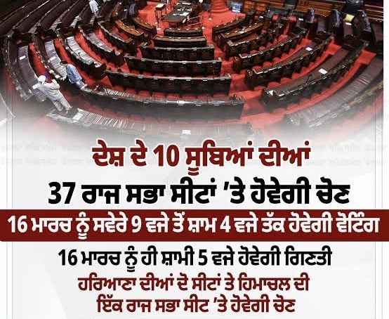 ਚੋਣ ਕਮਿਸ਼ਨ ਨੇ ਬੁੱਧਵਾਰ ਨੂੰ ਵੱਡਾ ਐਲਾਨ ਕਰਦਿਆਂ ਦੱਸਿਆ ਕਿ ਦੇਸ਼ ਦੇ 10 ਸੂਬਿਆਂ ਵਿੱਚ ਰਾਜ ਸਭਾ ਦੀਆਂ 37 ਸੀਟਾਂ ਲਈ ਦੋ-ਸਾਲਾ ਚੋਣਾਂ 16 ਮਾਰਚ ਨੂੰ ਕਰਵਾਈਆਂ ਜਾਣਗੀਆਂ। ਇਹ ਸੀਟਾਂ ਅਪਰੈਲ ਮਹੀਨੇ ਵਿੱਚ ਵੱਖ-ਵੱਖ ਤਰੀਕਾਂ ਨੂੰ ਖਾਲੀ ਹੋ ਰਹੀਆਂ ਹਨ।